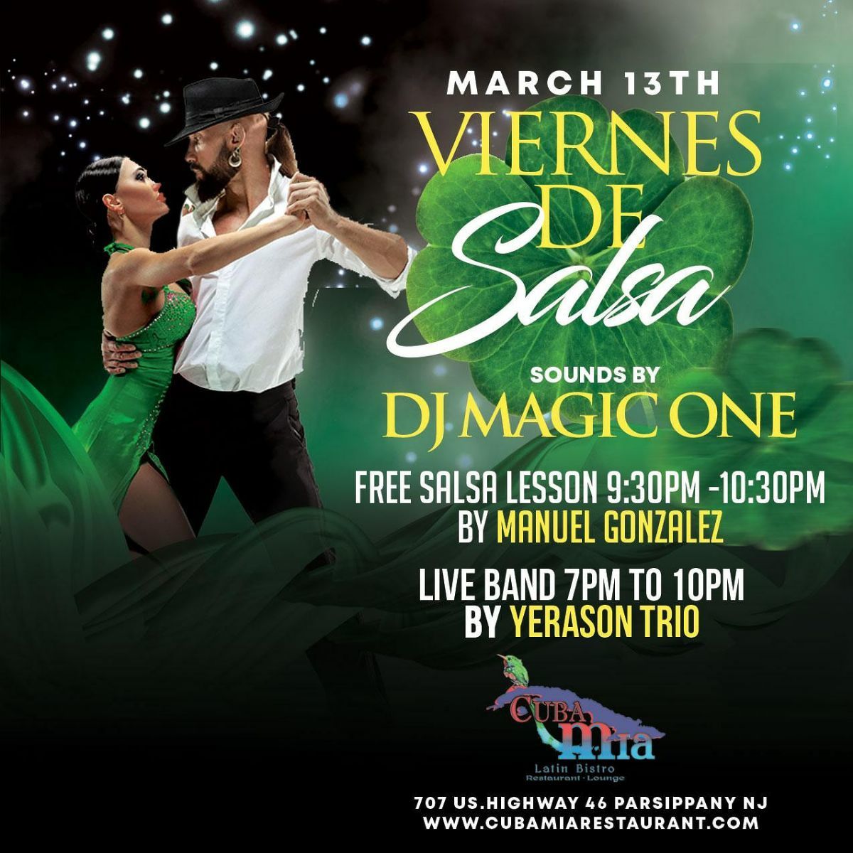 Classes offered from 8 to 10 pm Monday through Wednesday $15 for one hour or $25 for 2 hours. Private classes offered earlier call to schedule and for pricing. Free classes offered Fridays at Cuba Mia, Parsipanny from 9:30 to 10:30 pm. Saturday classes offered at 451 Mt. Pleasant Ave, West Orange, NJ from 12 to 2 pm.